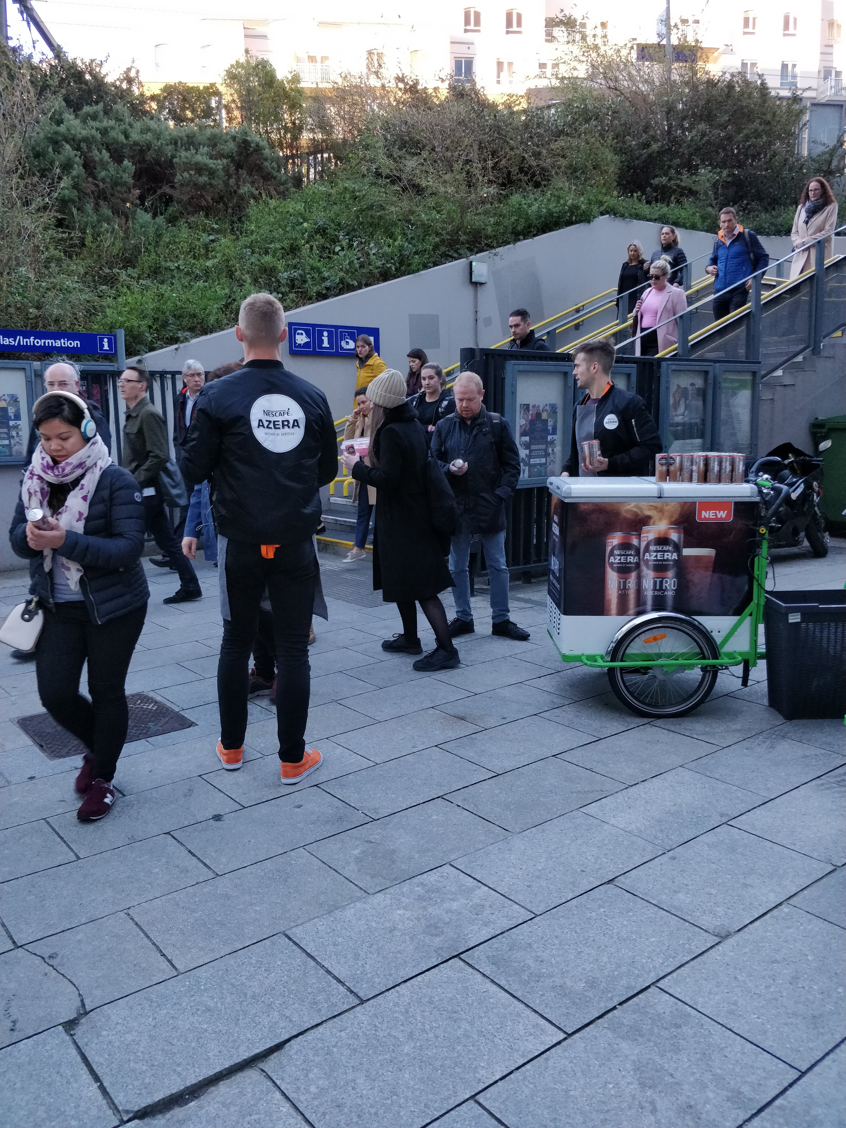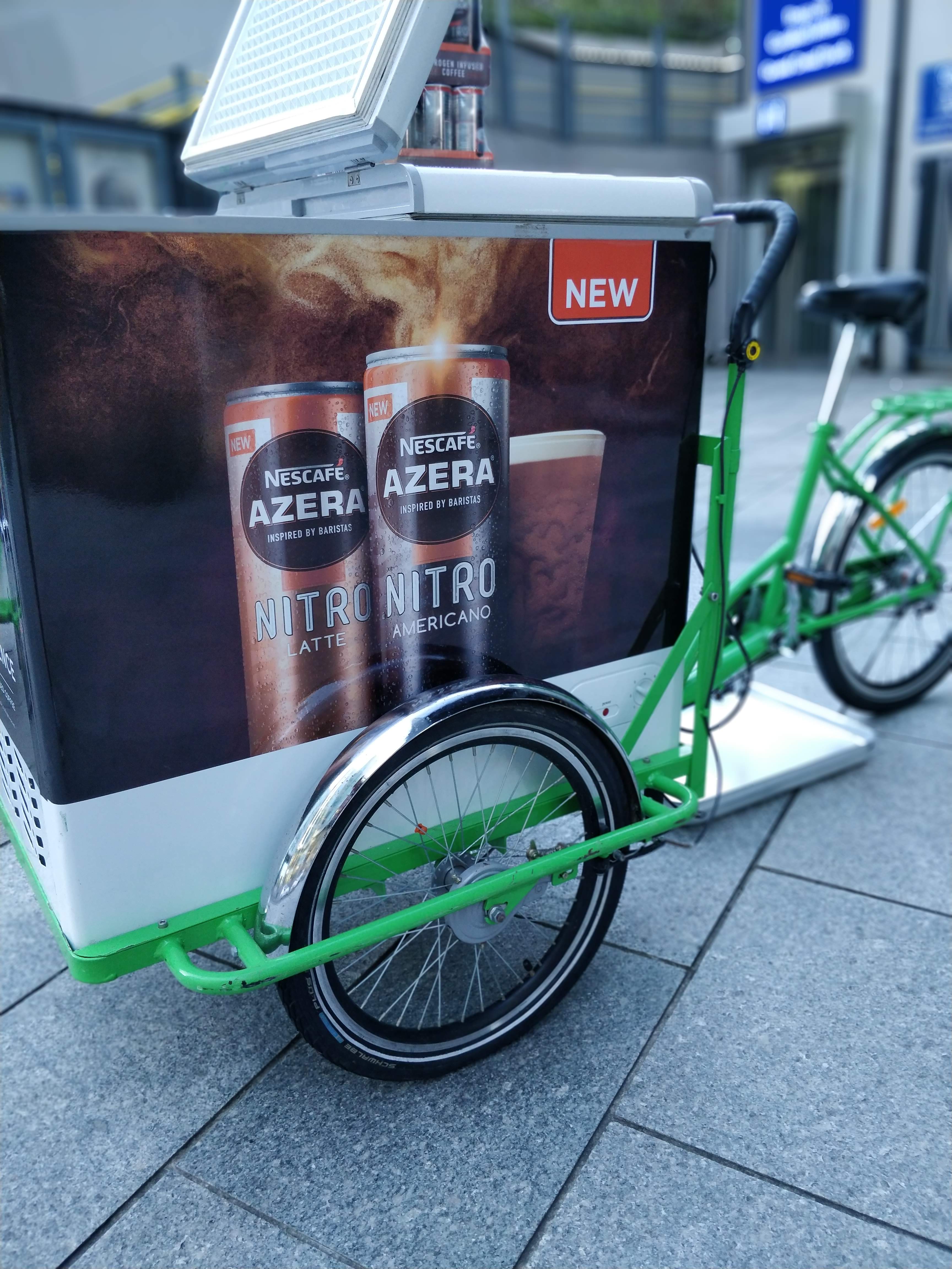 Early morning coffee run? we’ve got you with thanks to our mobile sampling bikes that can be at any location in no time! Yesterday, we were supporting Havas Marketing Agency. Our refrigeration sampling bikes were out in the early morning rush hour for the promotion of Nescafé’s new great tasting, Azera Nitrogen infused Americano and Latte cold brew coffee, at the Grand Canal Dock Dart station on Barrow Street, and later, on Mespil Road along the Grand Canal at the lunchtime market.